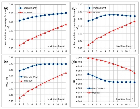 The benefit introduced by MCP-MT application can be also seen in Figure 4 where the results of the multi-temporal MCP are compared with those of the deterministic model for all the investigated lead-times for reach 1. The performance of MCP-MT is affected by the accuracy of the deterministic model and, consequently, it decreases with increasing lead-times, as shown in the figure. However, it is worth noting that MCP-MT introduces, compared with the deterministic model, a general reduction of the mean absolute error on stage forecast, m, of its standard deviation and of the RMSE for all the lead-times, while NS values increase. Similar results are observed for the reach 2 case study.