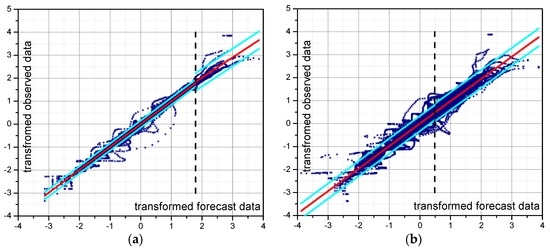The first analysis is performed by using the complete dataset of simulated forecasts to calibrate MCP-MT, i.e., for identifying the joint and marginal probability distributions. Figure 5 shows the joint distributions identified in the normal space for the forecasting model considering a lead-time of 12 h and 24 h for reach 1 and reach 2, respectively. The threshold automatically identified by the MCP-MT in order to optimize the sample data division for representing low and high flows separately is also depicted in the figure. The transformed of the forecast stage threshold, ηtr, is equal to 1.79 when STAFOM-RCM is applied to reach 1 (Figure 5a), while a different value of 0.5 is identified for reach 2 (Figure 5b). Specifically, the threshold identified for reach 2 divides the data into two samples, the first corresponding to low flows that include 68% of the data and the second one referring to high flows and containing 32% of the entire sample.