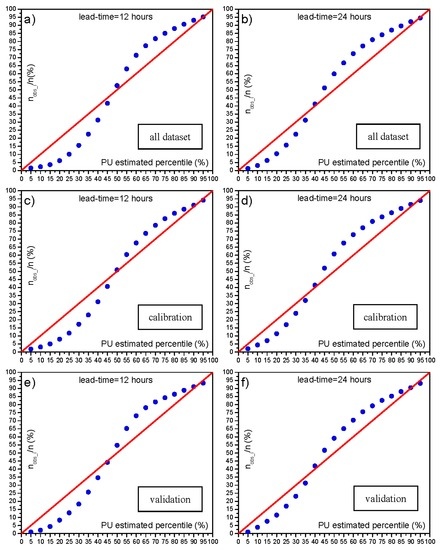 Figure 6c,e shows the comparison between the PU estimated percentiles and the corresponding percentages of observed occurrences falling below each percentile for the MCP-MT based on the forecasts of STAFOM-RCM for reach 1 (lead-time = 12 h), considering the calibration and the validation dataset, respectively. As it can be seen, the PU estimated percentile for the calibration period quite well matches with corresponding observed frequencies, mainly for percentiles higher than 50%. The shape of the curve is similar to the one obtained by calibrating the MCP-MT considering the whole available dataset (Figure 6a) and, hence, analogous considerations hold. It is worth noting that comparable results are achieved also for the validation dataset, shown in Figure 6e. Similar considerations apply to the results based on the forecast model application to the longer reach with a lead-time of 24 h (see Figure 6d,f).