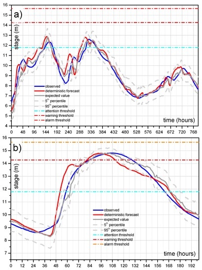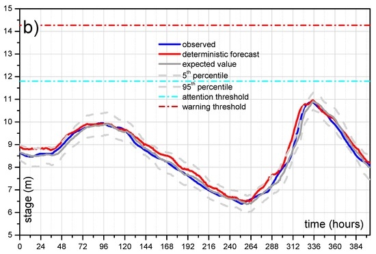 Furthermore, it is noteworthy that during the flood waves shown in Figure 7 and Figure 8 the observed stage has never reached the alarm threshold, which, properly, is never intersected by the uncertainty band estimated by MCP-MT. As concerns the warning threshold, it is actually exceeded only during the flood of August 2010 (see Figure 8b) as correctly forecasted by both the deterministic model and the MCP-MT uncertainty band.