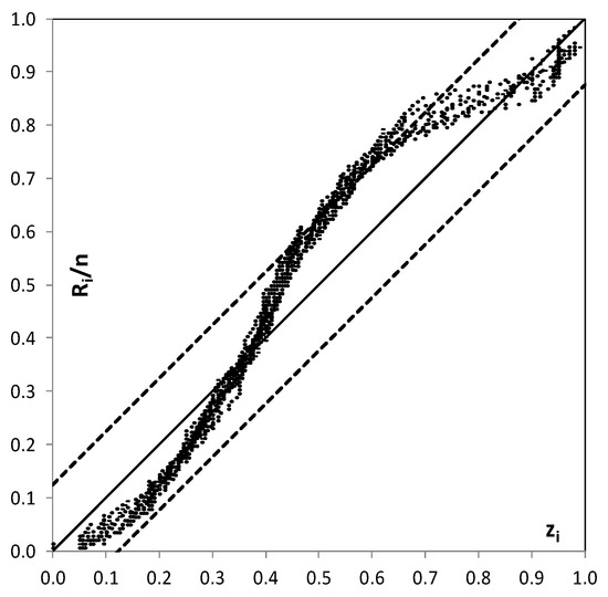 An additional analysis is finally carried out based on the “probability plot representation” (PPR) as described by Laio and Tamea [31]. The PPR is a plot of the values of the forecasted cumulative probability of the observed value xi, zi = P(xi), versus their corresponding empirical distribution function, Ri/n, with Ri = ranks and n = sample size. The PPR indicates if the uniformity test is passed or not and, also, the shape of the resulting curve gives information on the possible causes behind deviations from uniformity, i.e., placement of the points along the 1:1 line [10,31]. Moreover, the Kolmogorov confidence band can be displayed in the PPR indicating if the uniformity test is passed (the curve is inside the band) or not [31]. The PPR is here developed for the case study of MCP-MT results for the longer branch, reach 2, lead-time 24 h and focusing on the 2001 severe monsoon season. Following Laio and Tamea [31], we use 24 sub-series obtaining the results shown in Figure 9. Based on the indications provided by Laio and Tamea [31] to evaluate the results, it is clear that the forecasts provided by the probabilistic method are reliable (most of the forecasts remains inside the Kolmogorov band with 5% significance), even if the shape of the curves indicates that the predictions are large around the central value. The probability plot shows a large steepness of the curves, i.e., more zi points concentration, in the vicinity of 0.4–0.5 points.