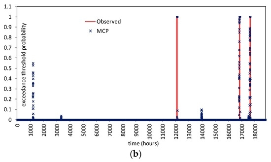 The analysis focuses on the “attention” and “warning” thresholds because the “alarm” threshold is not actually reached during the available dataset. The lead-times of 12 h and 24 h by considering the results of MCP-MT for reach 1 and reach 2, respectively, are selected for the analysis. As for the previous analysis concerning the PU estimate using MCP-MT, we first discuss the results obtained by using the all available dataset for calibration. The study compares the binary observed exceedance, equal to 1 when the observed stage is above the threshold level and equal to 0 when it is below, and the exceeding probability computed by the multi-temporal approach of the MCP-MT within the selected forecast lead-time period. Figure 10 shows the comparison for reach 1 (lead-time = 12 h) and for reach 2 (lead-time = 24 h) for all the available dataset. Specifically, at each time t the displayed value (between 0 and 1) represents the exceedance threshold probability estimated for the next 12/24 h. As it can be seen, when the threshold is really exceeded, the MCP-MT always estimates a probability equal to 1, i.e., provides the certainty of threshold exceeding. When the threshold is not actually exceeded, the processor provides very low probability values, mostly equal to zero. Only in one case, the ETP is found higher than 50% when the threshold is not actually reached (see Figure 10b), however it is worth noting that the maximum observed stage is only 18 centimeters below the threshold level.