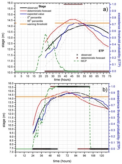 By inspecting the results shown for the flood which occurred on 6–10 August 2010 (Figure 11b), it can be noted that the warning threshold is actually exceeded at t = 58 h, while the deteministic model predicts the threshold overtopping 9 h in advance, at t = 49 h. The benefit introduced by the predictive uncertatinty estimate can be easily inferred by analyzing the results for the flood of August 2010 (see Figure 11b). In this case, the ETP increases very quickly starting from t = 24 h and reaches nearly the maximum value equal to 1 at t = 47 h. Moreover, the expected value, depicted as the blue line in the figure, passes the threshold at time t = 57 h, only one hour before the actual overtopping.