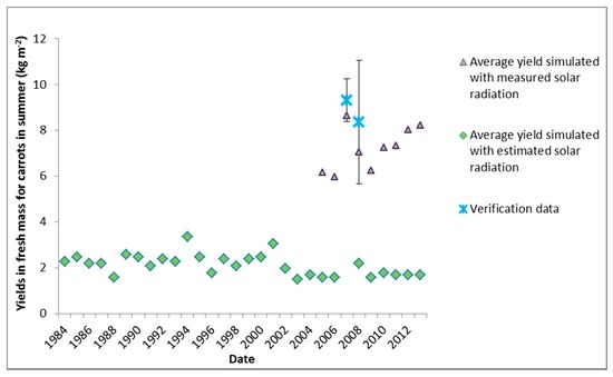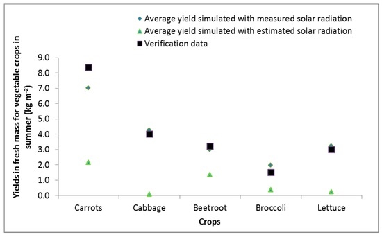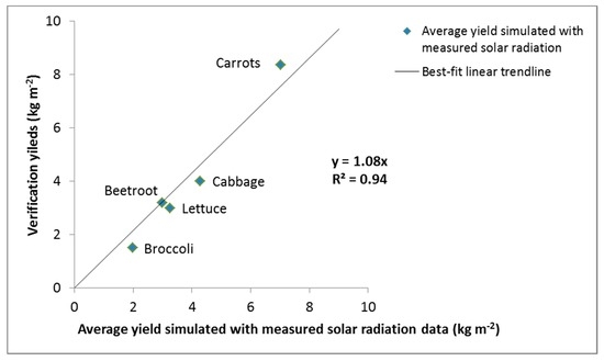 Figure 1 shows the effect of using estimated solar radiation to calculate ETo on simulated yields of carrots planted during summer, as compared to estimated yield results that were obtained using measured solar radiation data to calculate ETo after 2004. Similar discrepancies were found for cabbage, beetroot, broccoli and lettuce planted in summer and spring (Figure 2). The square of the correlation coefficient (R2) between verification yields and yields simulated with measured solar radiation of the five vegetables was 0.94, indicating strong correlation (Figure 3). The R2 for verification yields and yields simulated with estimated solar radiation for the five vegetables was 0.6, indicating poorer correlation. Estimated solar radiation data did not result in underestimated yields for crops planted in autumn and winter in the same way as for crops planted in summer and spring and in some cases yields were slightly over-estimated in these colder seasons. The reason why this effect is more prominent in summer and spring is plausibly because the study area is a summer rainfall region and solar radiation is more accurately estimated in the absence of cloud cover during autumn and winter. The SWB model has been widely applied and validated in South Africa, and proven reliable with regards to simulating soil water dynamics (including achieving mass balance) and crop growth and the model is not the source of these errors. SWB assisted us in understanding that solar radiation data estimated according to FAO 56 guidelines [56] may have led to inaccurate estimations of ETo in summer and spring. Therefore, the issue arises from slightly underestimated ETo which then results in underestimated yields. This finding may be applicable to all mechanistic crop models that estimate water-limited growth using ETo estimated based onFAO 56 guidelines [56].
