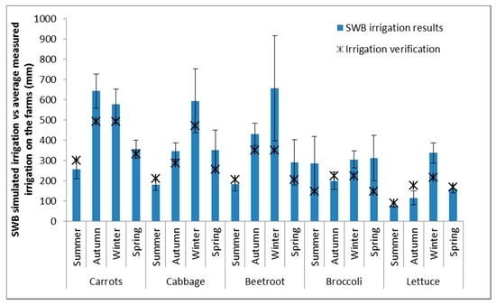 Figure 4. Average of 10 years’ simulated seasonal irrigation (2004–2013) with standard deviations (shown as error bars) of vegetable crops in the different growing seasons compared to measured irrigation verification data from farms on the Steenkoppies Aquifer.