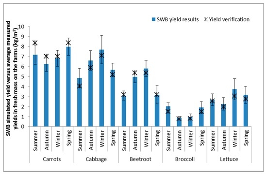 Figure 5. Average of 10 years’ simulated seasonal yields (2004–2013) with standard deviations (shown as error bars) of vegetable crops for the different growing seasons compared to measured fresh mass yield data from the farms on the Steenkoppies Aquifer.