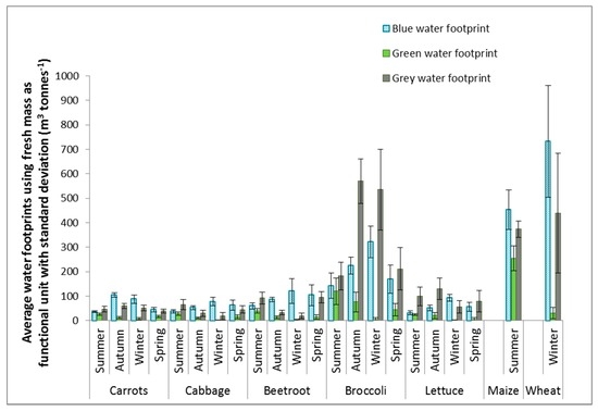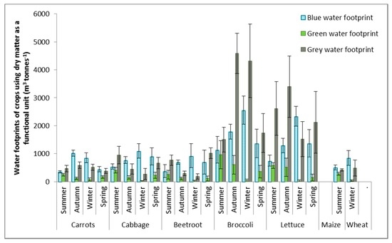 The WFs of the vegetable crops corresponded to the WFs reported by Mekonnen and Hoekstra [13] in some seasons. Total blue plus green WFs of carrots given by Mekonnen and Hoekstra [13] had a 15% correspondence to local blue plus green WFs of carrots in autumn. Total blue plus green WFs of beetroot given by Mekonnen and Hoekstra [13] corresponded to local blue plus green WFs of beetroot in summer, autumn and spring with a percentage difference of 8%, 7% and −9%, respectively. The WF of broccoli was higher than previously reported values, but corresponded well to local blue plus green WFs in spring with a −2% difference. Other seasons did not correspond well with WF results given by Mekonnen and Hoekstra [13], for example, the 120% difference in WF of summer carrots, 224% difference in WF for autumn cabbage and the 256% difference in WF of summer lettuce. Percentage differences between local WFs of cabbage and lettuce and those reported in the literature are very high for all seasons. Blue plus green WFs of wheat are much lower than the WFs given by Mekonnen and Hoekstra [13], with a 112% difference.