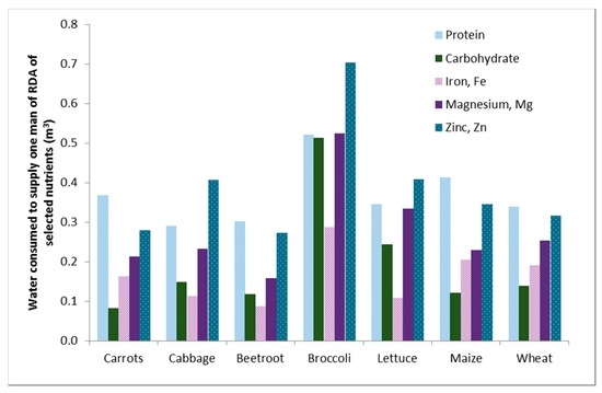 Figure 8. Blue plus green water footprint to supply a man (aged 31–50) with their Recommended Dietary Allowance (RDA) [61] in terms of selected nutrients.