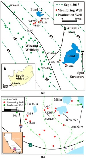 Maps of the field areas including locations of infiltration basins, production and monitoring wells, and local piezometric surface. (a) The Atlantis Managed Aquifer Recharge (MAR) site with an insert of South Africa and (b) the Orange County Water District (OCWD) MAR site down gradient from Kraemer Basin with an insert of California, USA. Please note that the approximate area of the OCWD MAR site is located on the California map with an arrow pointing at a small black rectangle.