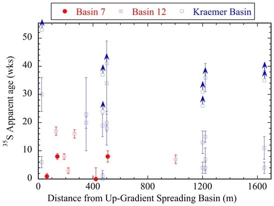 The resulting 35S apparent ages range between <1 wk to >53 wks. In fact, in seven samples (from three wells) ages could not be calculated because the groundwater activity exceeded the source water value calculated with Equation (2). This shows that the source water initial activity is more complicated than simple mixing between low [SO4] GWRS and other higher [SO4] waters. Urióstegui et al. [38] used a different approach and estimated different 35S apparent ages down gradient from Kraemer Basin.