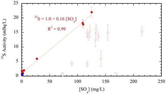 35S activities and [SO4] from source water samples at the OCWD MAR site. The data is from either Table 1 or Urióstegui et al. [38]. The linear fit is for the data we believe have not undergone significant radioactive decay (filled red dots). The open red dots represent samples we interpret as having experienced significant radioactive decay and the blue squares are samples of GWRS water. The resulting line is used to calculate initial 35S activities, A0, for down gradient wells from Kraemer Basin (see Table 3).