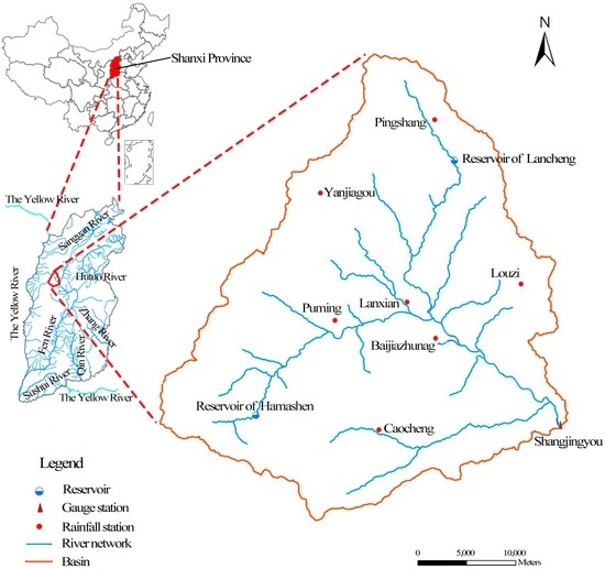 The Lanhe Watershed, located in the upper and middle reaches of the Yellow River, is a representative region of the Loess Plateau. The Lanhe River is a secondary tributary of the Yellow River, and lies in the middle of Shanxi Province, China (Figure 1). The study area is about 1140 km2, the total river length is 57.6 km, and the mean of the river slope is 4.05‰. It has semi-arid and arid climate characteristics, with less precipitation in winter and spring, and more rain in summer and autumn, the precipitation of which accounts for more than 60% of the annual precipitation [30,31]. The weather is affected by local and regional climatic influences, with northwestern winds in late autumn, winter, and spring, and southeastern winds in summer. The annual precipitation is 477.3 mm, the annual temperature is 8.8 °C, and the annual evapotranspiration is 1310.7 mm. In the Lanhe Watershed, about 80% of the annual precipitation falls from June to September (the flood season), and is usually concentrated in several rain events during July and August [32]. Streamflow in the flood season accounts for 60%–80% of the annual total streamflow, and runoff generation is dominated by surface runoff, produced by the infiltration-excess mechanism; baseflow is commonly from 0.1 m3/s to 0.3 m3/s [33]. The location of the Lanhe Watershed is shown in Figure 1.