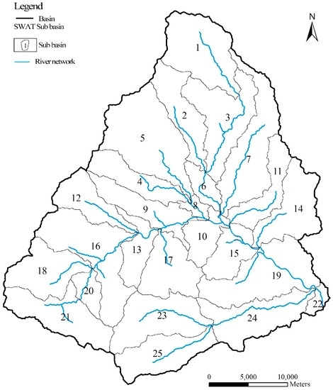 In this study, model setup and parameterization were done using the ArcSWAT interface. First, the Lanhe Watershed was divided into 25 subbasins, decided by a threshold area of 1000 ha (Figure 2) with DEM data of 30 m in resolution. Then, all subbasins were fully divided into 81 hydrologic response units (HRUs), based on a combination of land use, soil class (type), and land slope, representing over 15% threshold of land use, soil, and slope, respectively.