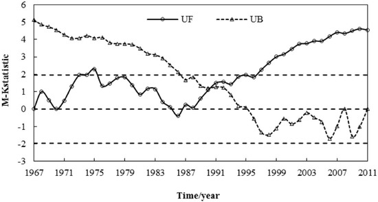 UF and UB are standardized statistical series which can be written as Equations (4) and (5) in the M–K test [61]. When the UF curve and the UB curve intersect in the confidence zone, the cross point indicates that it is an abrupt point [61].