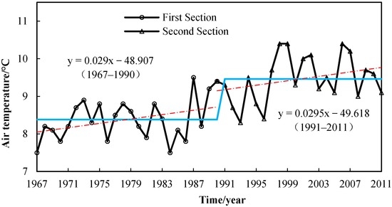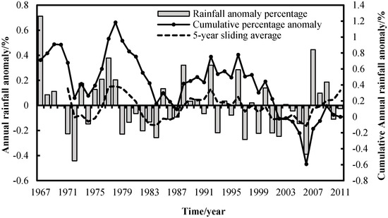 Figure 3 and Figure 4 show temperature tendency and change, and Figure 5 demonstrates precipitation tendency and change. According to Figure 3 and Figure 4, the mean annual temperature presented a wave of increasing tendency, which experienced a sudden change, which was the intersection point between UF and UB curves in 1990. The annual average temperature, maximum temperature, and minimum temperature were 8.8 °C, 10.4 °C, and 7.5 °C, and the rate was 0.29 °C every 10 years. From Figure 5, the precipitation for a five-year moving average anomaly showed a decreasing tendency. In the periods of 1967–1972, 1979–1984, and 1993–2006, precipitation presented a decreasing tendency. However, in 1973–1978, 1985–1992, and 2007–2011, the precipitation indicated an increasing tendency. The annual average, maximum, and minimum precipitations were 477.3 mm, 816.9 mm (1967), and 266.5 mm (1972).