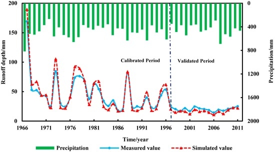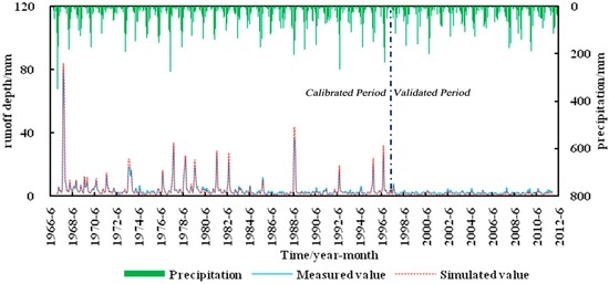The results of model calibration and validation are shown in Table 2 and Figure 6 and Figure 7. From the calibration and validation results of annual and monthly streamflows, R2 values are 0.95 and 0.84, and 0.78 and 0.72, and all results greater than 0.5 are considered to be acceptable; Ens values are 0.78 and 0.72, and 0.74 and 0.67, and the simulated results of the ratings are “very good” or “good”; PBIAS values are 0.6% and −9.1%, and 22.1% and 18.8%, with a performance rating of “very good” for the calibration period, and a rating of “satisfactory” for the validation period. According to the evaluation criteria, the performance rating of the overall model simulated was “satisfactory”. Figure 6 and Figure 7 show that the measured and simulated annual and monthly streamflow were closely followed most of time. To sum up, the statistic values proved that the model performed well, not only on an annual scale but also on a monthly scale in the Lanhe Watershed, and that it can be used to predict water resources (surface runoff and baseflow).