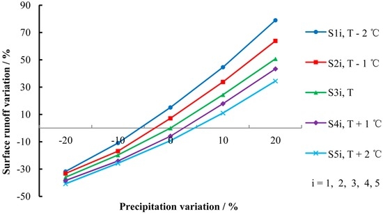 With respect to situations where the same temperature is used, the relative changes of surface runoff increased in the range of 20.3% (8791.9 × 103 m3, S54–S53) to 34.3% (14,910.2 × 103 m3, S15–S14), while the precipitation change increased by 10%, and the relative changes of surface runoff decreased in the range of 14.3% (6205.2 × 103 m3, S42–S41) to 26.0% (11,293.9 × 103 m3, S13–S12) while the precipitation decreased by 10%, relative to the S33 scenarios. The performance indicated that the contribution of increasing the relative precipitation variation rates was greater than that of the decrease for surface runoff.