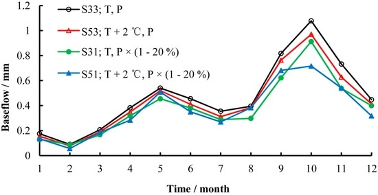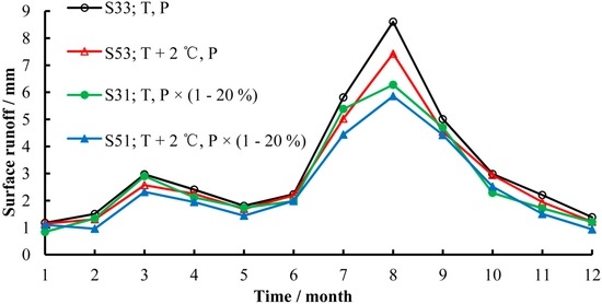 In order to learn more about the changes in surface runoff and baseflow within a year, it is necessary to analyze periodic features of surface runoff and baseflow. In this paper, and based on flood and irrigation water management, the hydrological year was divided into four periods: the first period (the pre-crop period) from March to May, the second period (the flood season) from June to September, the third period (the post-flood season) from October to November, and the fourth period (the ice period) from December to February. Monthly surface flow changes were simulated under four scenarios: S31, (1 − 20%)P, T; S33, P, T; S51, (1 − 20%)P, T + 2 °C; and S53, P, T + 2 °C.