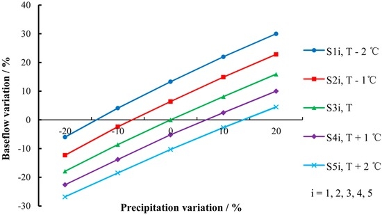 For the same temperature, the relative changes in baseflow caused by decreasing precipitation are greater than those caused by an increasing precipitation. For instance, when the precipitation change decreases by 10%, the baseflow will decrease from 530 × 103 m3 to 652.8 × 103 m3, by 8.2% to 10.1%; when the precipitation change increases by 10%, the baseflow will increase from 491.3 × 103 m3 to 562.3 × 103 m3, by 7.6% to 8.7%.