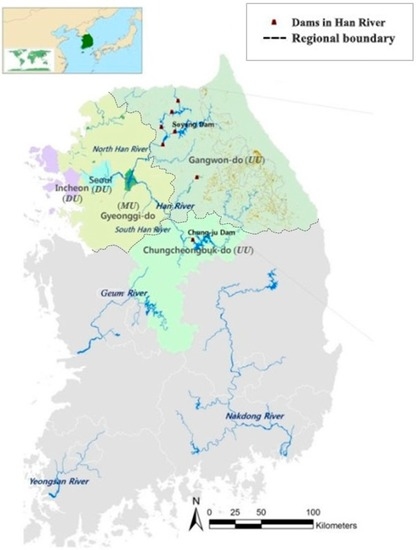 The Han River is used not only as a major drinking water source but also for recreational activities and aesthetic amenities yielding positive externalities for the stakeholders. As South Korea carried forward its industrialization during the 1970s, however, multi-purpose dams were constructed in the upstream areas of the Han River to develop water resources and to provide water and electrical energy to the mid- and downstream regions of the Han River, which has led to many controversies and disputes [3]. The Soyang Dam in the upstream regions of the Han River, located 10 km northeast of Chuncheon_si, Gangwon_do is an example of the case above. Since its establishment in 1973, its nearby areas have been designated as protected areas to stabilize water conditions in terms of water quantity and quality [4]. This restriction has resulted in unfair economic growth from the use of water resources among stakeholders along the Han River. There are five regulations ((1) Water Supply and Waterworks Installation Act for protected areas of tap water source; (2) National Land Planning and Utilization Act for nature conservation zones; (3) Act on the Improvement of Water Quality and Support for Residents of the Han River Basin for waterside zones; (4) Forest Protection Act for watershed conservation zones; and (5) Water Quality and Aquatic Ecosystem Conservation Act for designation of zones for application of allowance standards of wastewater emission; while the first four regulations apply to 521.9 km2 that covers only 3.1% of Gangwon_do, the last covers 73.0% of it, which means 76.1% of Gangwon_do is regulated by several acts related to water management for DU and MU) maintained on water management associated with economic activities along the Han River in upstream areas. Especially, while MU and DU have gained many tangible and intangible benefits from the Han River, UU have lost their opportunities to achieve economic growth as well as to enjoy recreational activities in the Bukhan River and the Namhan River.