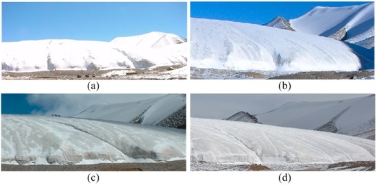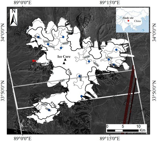 The PIF is located on the northern central Tibetan Plateau and the western portion of the Tanggula Mountains, with central coordinates of 33°55′ N and 89°10′ E [26] (Figure 1). The glaciated area covers more than 420 km2 and a volume of approximately 52 km3 [27]. The equilibrium-line altitude (ELA) of the PIF lay at 5748 m·a.s.l. between 2001 and 2012 [28]. The glacier system is composed of approximately 50 glaciers with variable lengths radiating from the center of the ice field and extending halfway down-valley to the piedmont terminus. Glacier melt-water contributes to three endorheic lakes, named Linggo Co, Dogai Coring, and Chibuzhang Co [29]. According to the lake catchments, the ice field is divided into three parts—i.e., the northern, eastern and western slopes.