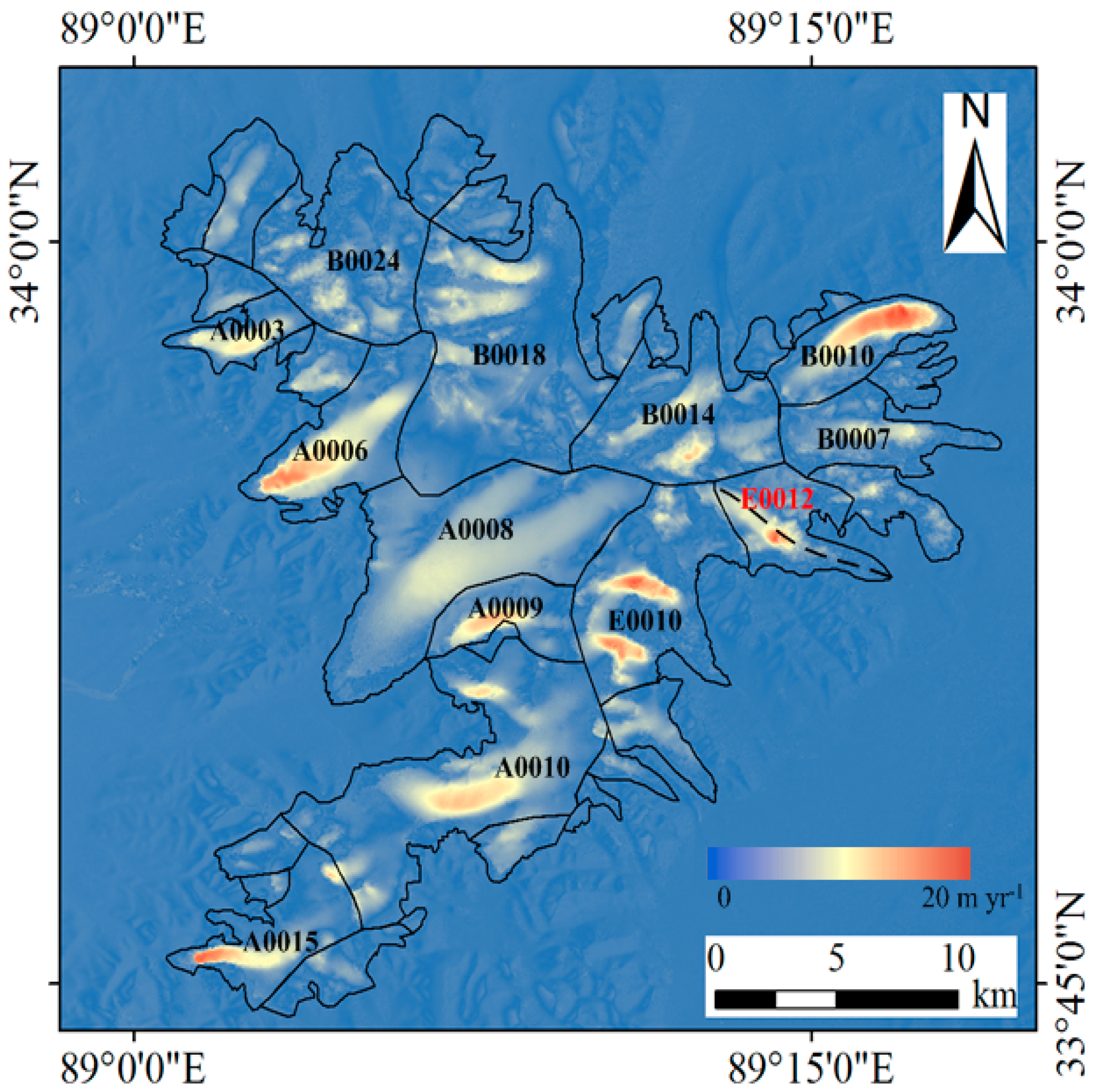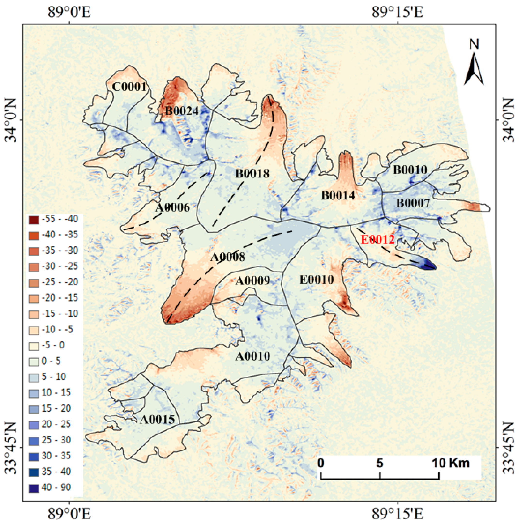 Elevation changes (unit: m) over the Puruogangri ice field between 2000 and 2012. Glacier outlines were delineated from a Landsat TM image. The last five codes of the WGMS IDs of the glaciers with a size exceeding 10 km2 are presented. Glacier E0012 (WGMS ID: 5Z213E0012) is a surge-type glacier. The glacier central flow lines are indicated in dashed black.