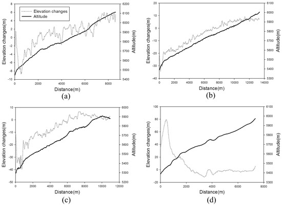 Surface elevation changes vs. altitude along the central flow lines for glacier 5Z611A0006 (a); 5Z611A0008 (b); 5Z513B0018 (c); and 5Z213E0012 (d). The profile locations are shown in Figure 2.