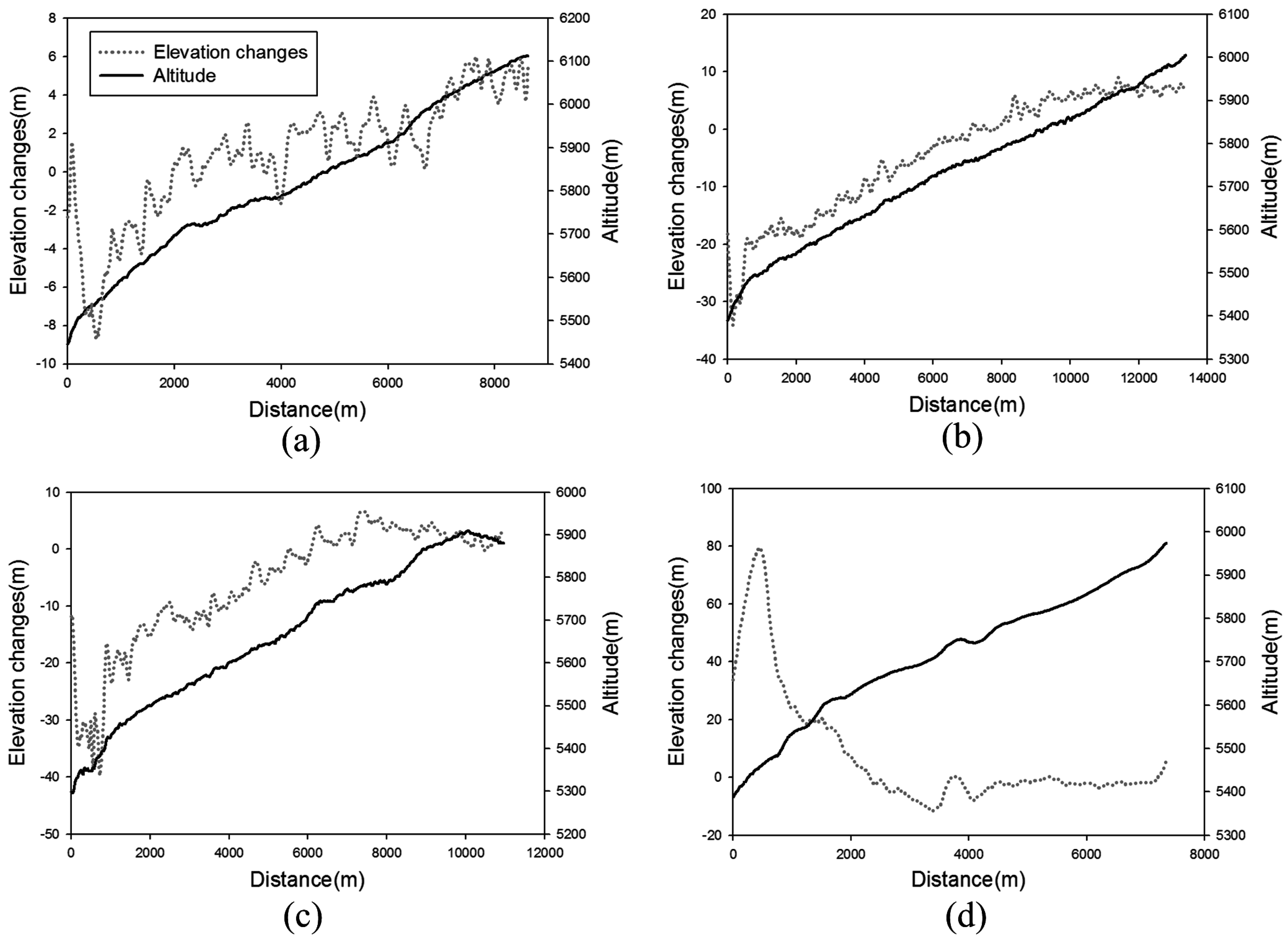 As shown in Figure 2, clear surface thinning was observed in most glacier tongue regions, with a maximum elevation decrease of up to approximately −40 m, whereas a slight thickening was detected in the broad and flat interior regions (mostly in accumulation areas) above 5800 m·a.s.l. In general, this spatial pattern of glacier elevation changes over the PIF was similar with that revealed by Neckel et al. [12]. Particularly, it is worth noting that the surface elevation changes varied for individual glaciers. Most glaciers experienced predominant surface lowering of approximately 20–40 m at glacier terminal regions, e.g., glacier No. 5Z611A0008 and No. 5Z513B0018; however, several glaciers (e.g., No. 5Z611A0006) exhibited no obvious changes in elevation, except for one thickening glacier (No. 5Z213E0012) in the eastern PIF. Probably due to surging activities, this anomalous glacier was thickened by up to approximately 80 m at the terminus, whereas negative elevation changes were observed in the upper ablation areas. Figure 3 highlights the detailed features of surface elevation changes and altitudes along the central flow line of these four selected glaciers.