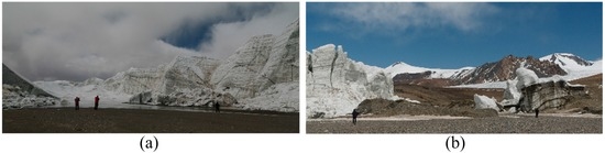 Melt-water and ice cracking at the glacier snout (No. 5Z611A0008) recorded in 2011. (a) View from the eastern side; (b) view from the western side.