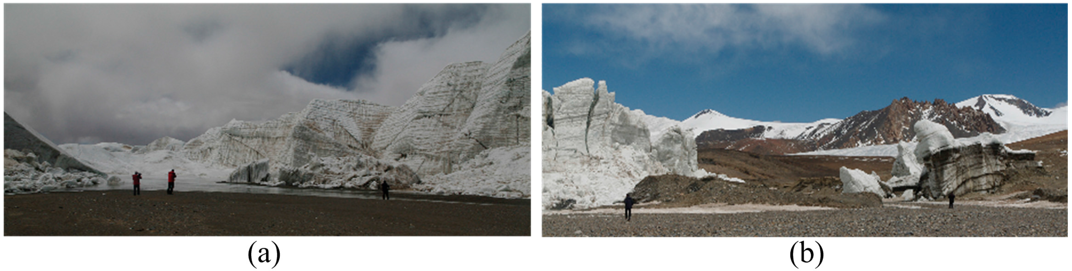 - Pu, J.; Yao, T.; Wang, N.; Ding, L.; Zhang, Q. Puruogangri ice field and its variations since the Little Ice Age of the Northern Tibetan Plateau. J. Glaciol. Geocryol. 2002, 24, 87–92. (In Chinese) [Google Scholar]