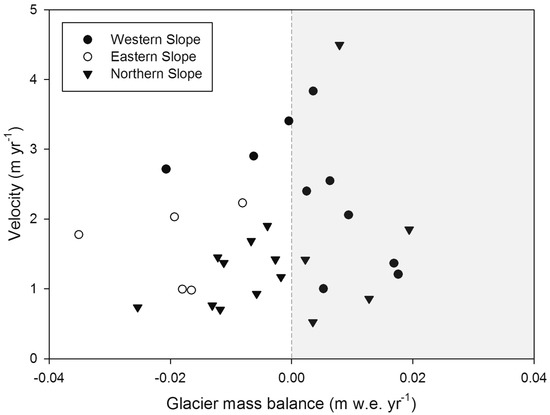 In this study, our results revealed that the glacier mass balance of the Puruogangri ice field is primarily affected by mean altitude and ice flow velocity, and may be slightly affected by slope. Note that the debris cover is not included in our analysis because it does not cover glaciers of the PIF [29]. Generally, the altitude dependency of glacier mass balance over the PIF was supported by the stronger surface melting at lower elevations, which was found for several glaciers in the Himalaya and Karakoram [1,2]. However, Berthier et al. [19] reported that glaciers in the Spiti/Lahaul (western Himalaya) experienced thickening or limited thinning below 4400 m. Moreover, the velocity-dependent glacier elevation changes confirm the effect of velocity on glacier mass changes in Bhutan, Himalaya [23]. Additionally, although surface slope was slightly correlated with glacier mass change on the PIF, it was a major topographic control of glacier mass balance in eastern Himalaya [21].