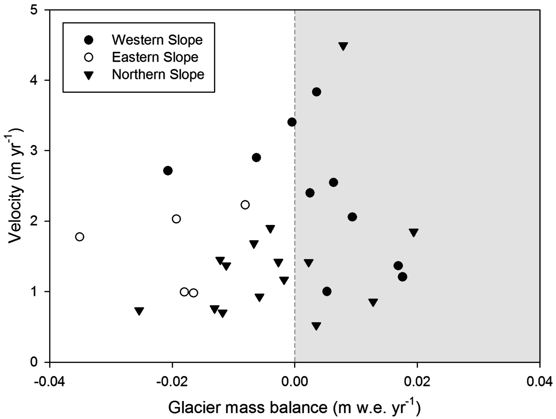Scatterplot of mass changes of glaciers in the western, eastern, and northern parts of the PIF.