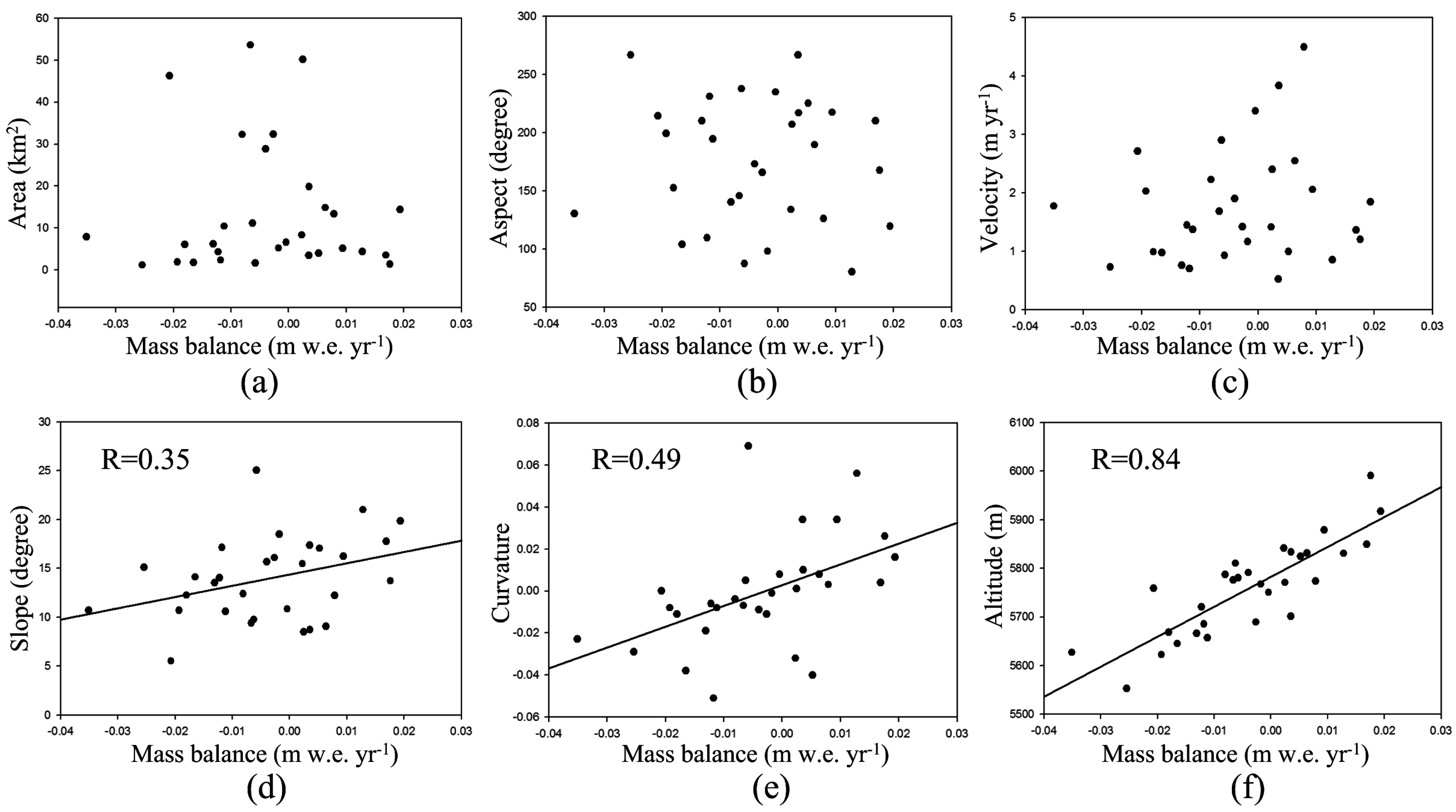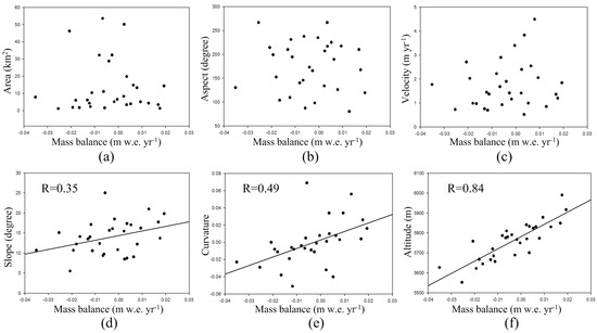 Correlations between glacier mass balance and individual morphometric factors from the SLR analysis: (a) size; (b) aspect; (c) ice flow velocity; (d) slope; (e) curvature; and (f) altitude.