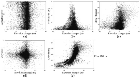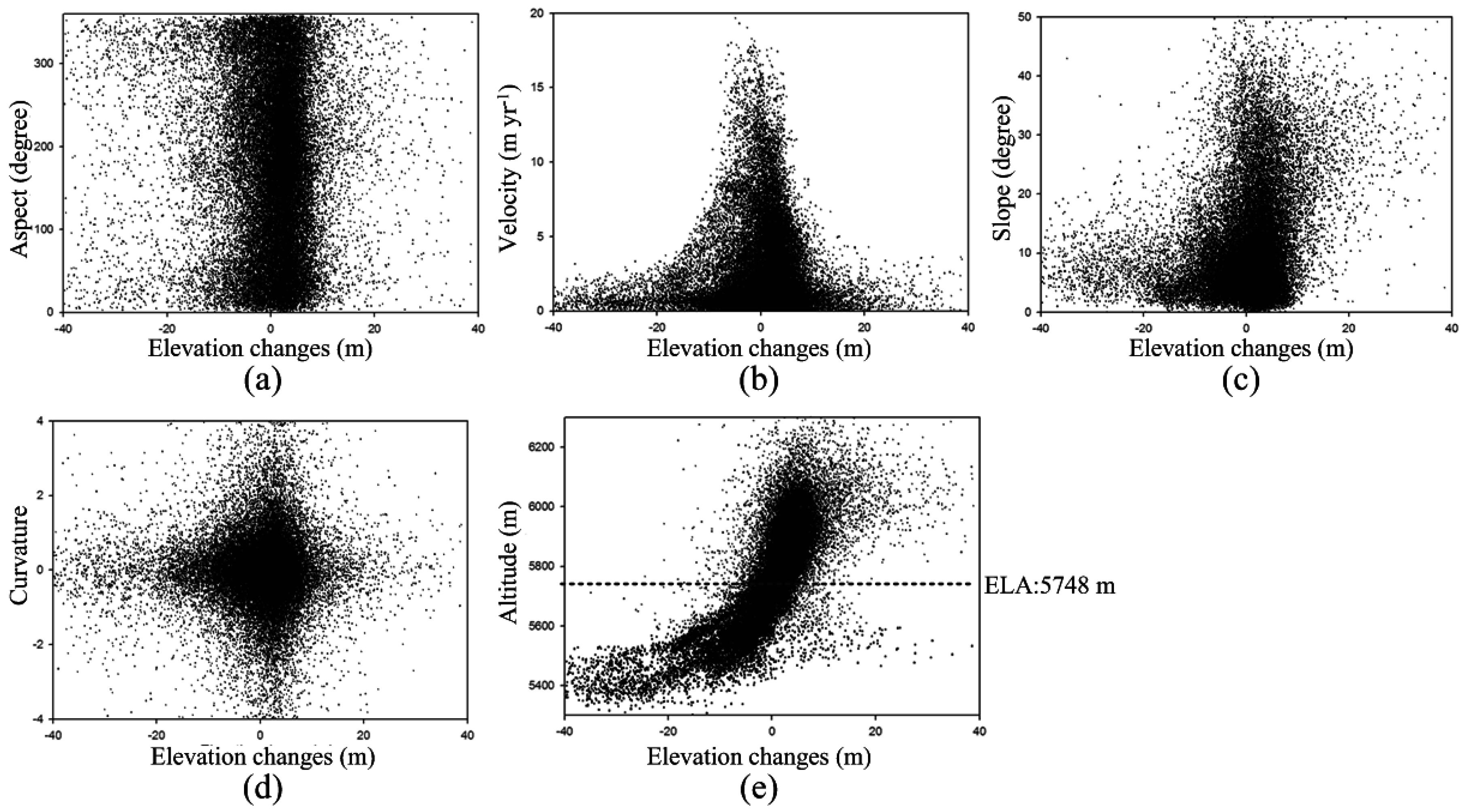 In order to further estimate the effect of morphometric factors on glacier mass changes at a more local scale, the whole ice field was divided into the grids with a size of 10 × 10 pixels. Note that the factor of glacier area was not included in the analysis due to the same size of all meshes. Figure 9 exhibits the correlation between glacier elevation changes and five morphometric factors over entire meshes of the PIF. Obviously, the factor of aspect was not a statistically significant control on glacier elevation changes. As shown in Figure 9a, there was not any apparent difference of glacier elevation changes in different aspects. The glacier mass changes might be slightly correlated with surface slope and curvature. Figure 9c,d illustrates that the grid with smaller slope and curvature might be more possible to experience a larger value of glacier thinning or thickening. Figure 9e shows that the factor of altitude should be an effective control of glacier elevation changes. In particular, the relationships between altitude and glacier elevation changes are different between the glacier tongue and upper regions. Specifically, when altitude increases, surface thinning over glacier tongue areas (altitudes of 5400–5700 m) decreases quickly, but surface thickening increases slowly around the ELA and its upper areas (altitudes of 5700–6200 m). It is noteworthy that glacier grids with higher ice flow rates possibly experienced a relatively stable glacier surface elevation, whereas obvious glacier thinning and thickening were usually found over quasi-stagnant grids (lower ice flow rate), as demonstrated in Figure 9b. It infers that surface velocities might affect glacier elevation changes at local scales.