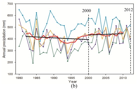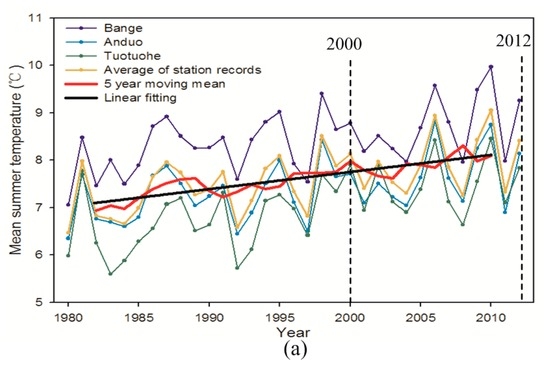 The records of mean summer temperature (a) and annual precipitation (b) from 1980 to 2012, which were estimated from climatic observations of the Tuotuohe, Bange, and Anduo meteorological stations. The five-year moving averages of mean summer temperature and annual precipitation are shown in red lines. The changes of linear fitting in temperature and precipitation are indicated as black lines. Two vertical dashed lines indicate the year of 2000 and 2012, which are the start and end time of the period of investigation in this study.
