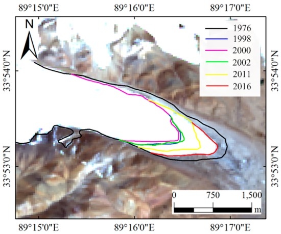 In order to validate the surging event of glacier 5Z213E0012, we detected changes in glacier terminus positions from 1976 to 2016, which were retrieved by one Landsat Multi-Spectral Scanner (MSS) image in 1976, two Landsat Thematic Mapper (TM) images in 1998 and 2010, two Landsat Enhanced Thematic Mapper Plus (ETM+) images in 2000 and 2002, and one Landsat Operational Land Imager (OLI) image in 2016.