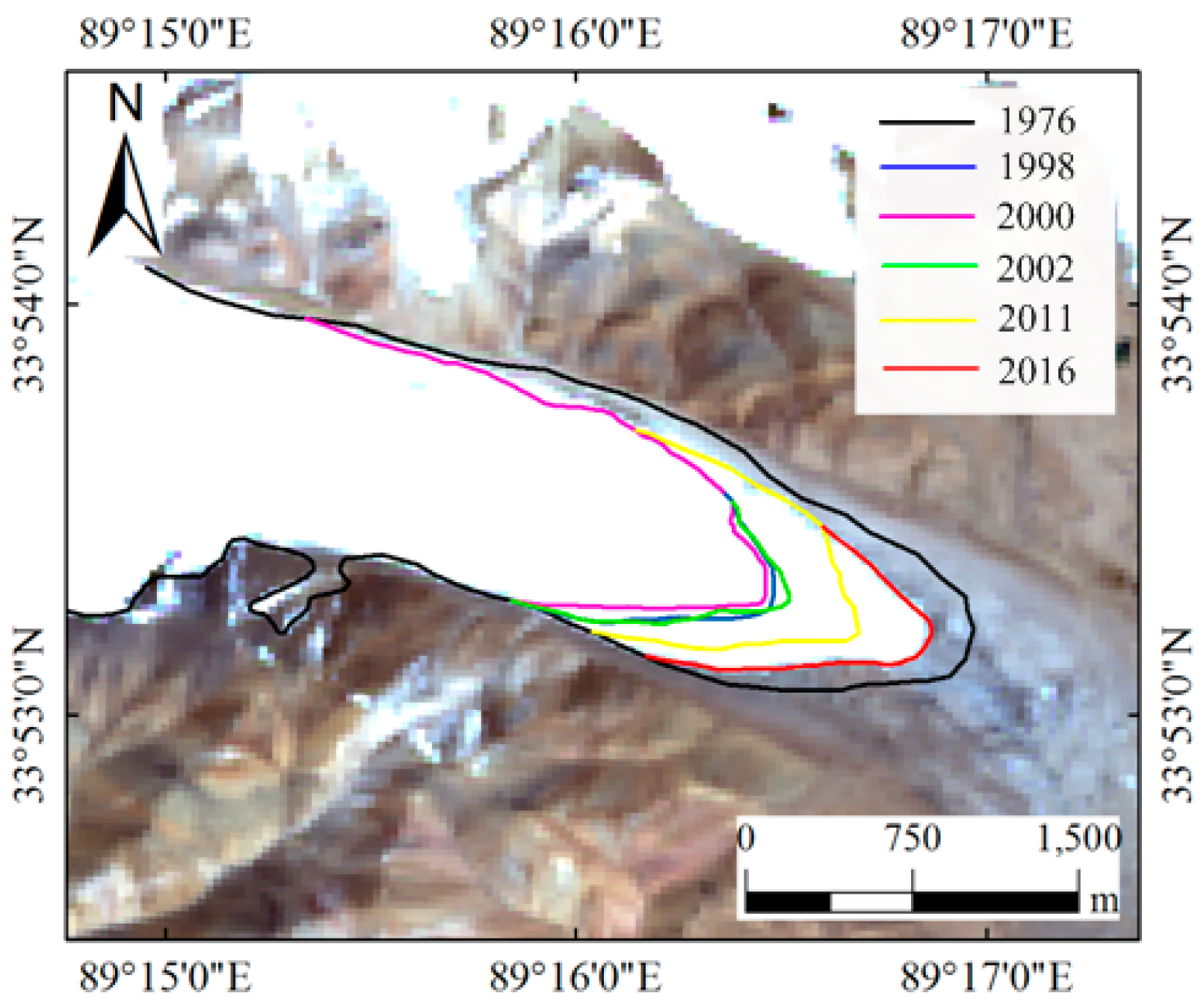- Wu, K.; Liu, S.; Guo, W.; Wei, J.; Xu, J.; Bao, W.; Yao, X. Glacier change in the western Nyainqentanglha Range, Tibetan Plateau using historical maps and Landsat imagery: 1970–2014. J. Mt. Sci. 2016, 13, 1358–1374. [Google Scholar] [CrossRef]