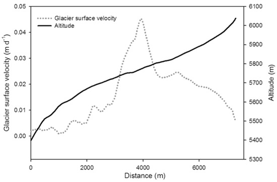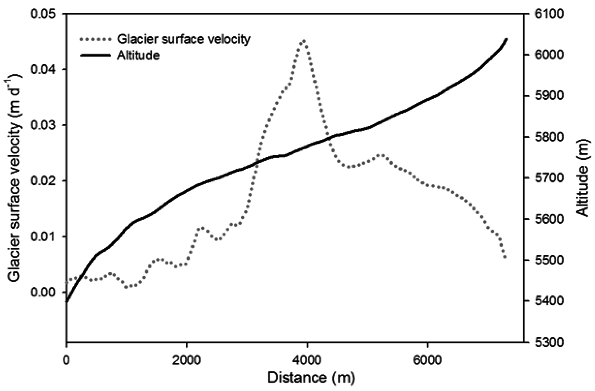 Ice flow velocities (in 2009) vs. altitude along the central flow line of glacier 5Z213E0012. The profile location is shown in Figure 6. In order to comparing with the results in 1996, the unit of glacier surface velocity was converted from m·year−1 to m·day−1.