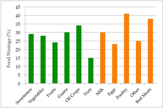 Figure 2 shows the relative waste of food by category. According to these data, meats are the most wasted and nuts are the least wasted food. When grouped by source, food losses average 31% and 27% for animal-based and plant-based products, respectively. These mean losses are consistent with published studies from the USA and other industrialized nations that estimate food losses in the consumer/retail sector at 25% to 33% [26,27,28]. Household food waste has been correlated with income level, and the major causes include overbuying food in stores, preparing too much food for meals and failing to consume perishable foods before their expiration dates [29].