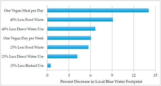 Adopting a diet that includes one vegan day per week results in a decrease in the local blue water footprint that is slightly greater than that of a 25% reduction in food waste. A diet that includes just one vegan meal per day (assuming three meals total) achieves a decrease in the blue water footprint more than double that of reducing direct water use by 40% and more than 1.5 times greater than that of reducing food waste by 40%. These estimates suggest that although diets and food waste are extremely difficult to monitor, they possess a greater potential to reduce the internal blue water footprint in California than restricting residential water use. Vegetarian diets were not considered because the dataset did not distinguish between the feed destined for dairy cows and egg-laying chickens from that provided to animals butchered for their meat.