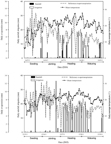 Rainfall, evaporation, irrigation, and temperature during crop growth stages in 2014 and 2015.