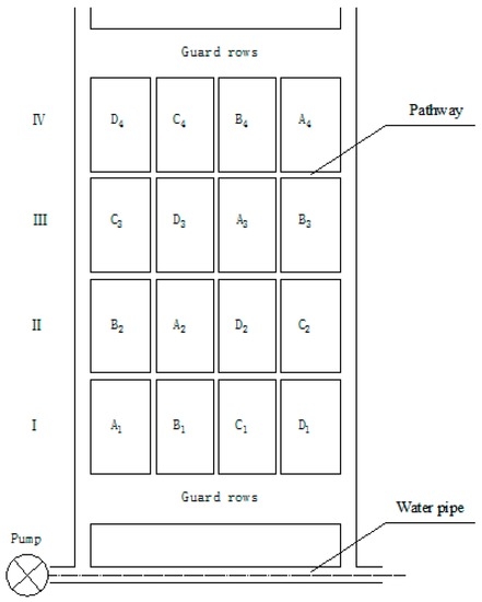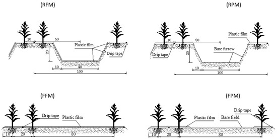The experiment treatments were all based on drip irrigation and included two plastic film mulch treatments (full vs. partial mulch) and two tillage treatments (ridge vs. flat tillage), respectively. There were four combined systems: (1) alternating ridges (40 cm wide and 20 cm high) and furrows (40 cm wide) with plots fully mulched with plastic film (RFM); (2) alternating ridges (40 cm wide and 20 cm high) and furrows (40 cm wide) with partial film mulch (only the plant rows mulched) (RPM); (3) flat tillage with plots fully mulched with plastic film (FFM); and (4) flat tillage with partial film mulch (only the plant rows mulched) (FPM). The cropping pattern is shown in Figure 2. Each treatment was replicated four times and each experimental plot was approximately 4 m × 12 m in a completely randomized block design (Figure 3). The plastic film in all treatments was transparent polyethylene and 0.008 mm thick. The experimental crop was maize (cultivar Xi-meng 6, Xi-meng Seed Ltd., Inner Mongolia, China) with wide–narrow row sowing and the whole growing season required approximately 120 days. The drip tapes were laid out in the middle of narrow rows and used to deliver water with flow rates of 1.38 L/h in 2014 and 2.7 L/h in 2015. The drip tape spacing and emitter spacing were 100 cm and 30 cm, respectively. Two rows of maize were planted on both sides of the drip tape with a 20-cm space between two rows.