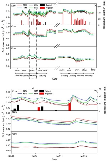 During the 2014 and 2015 season, soil water content showed a similar interannual trend and fluctuated with irrigation, precipitation and temperature (Figure 4a). Due to limited precipitation, soil moisture was mainly influenced by irrigation. Soil moisture in all treatments increased from 0-cm to 40-cm soil depth and then decreased from 40-cm to 70-cm soil depth during seeding and heading stages. Figure 4a also reveals that RFM had higher soil moisture than RPM, FFM and FPM in the 0–20-cm layer throughout all growing stages. With increasing precipitation and irrigation, the soil water content in RFM and FFM was much higher than in RPM and FPM in the 70-cm layer, suggesting a greater infiltration associated with reduced evaporation in full film mulching. During the heading and maturing stage, soil moisture in RFM in the 40-cm layer fell below FFM, and the same was observed for FPM vs. RPM. The soil water content in full film mulched treatment was lower than in partial film mulched treatment in the 40–70-cm layer. This indicates that although ET for the full film mulched treatment was more reduced than that of the partial film mulched treatment, the full film mulch did not increase the soil water content, but rather promoted vigorous plant growth resulting in a higher plant transpiration rate and overall more soil water loss.