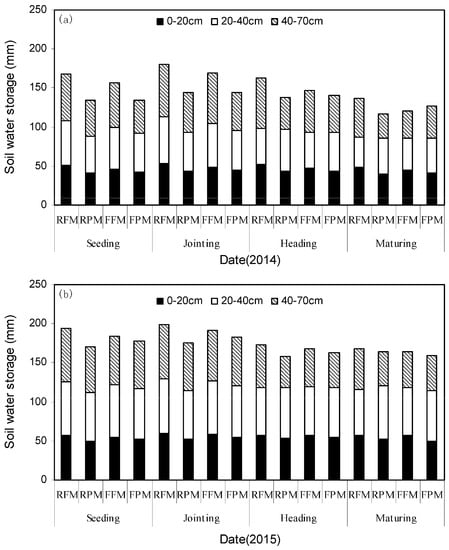 Figure 5 illustrates the changes of soil water storage in 0–70-cm layers during the growth period in 2014 and 2015. In accordance with soil moisture variation, the range of soil water storage in the main root region (0–40-cm) is greater than in the deeper layer (40–70-cm). In addition, there were obvious differences in soil water storage among these four treatments at the same stage and the highest and lowest values were recorded in the seeding and maturing stages, respectively. It was notable that soil water storage in the 20–40-cm layer in RFM and FFM was lower than RPM and FPM during the heading and maturing stages. The fully mulched plots (RFM and FFM) generally had the largest soil water storage in the 0–70 cm soil profile.