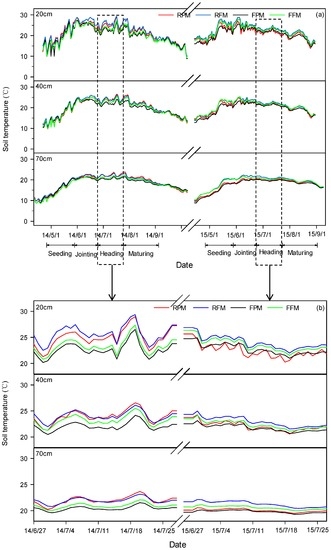 Daily average soil temperature of 0–70-cm layer in different treatments (a) during the growth period in 2014 and 2015 and (b) during the heading stage in 2015.