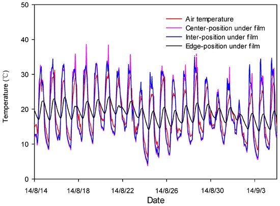 Daily changes of temperature in different positions under film, with the air temperature as a reference. Center-position under film (horizontal distance from the dripper is 0 cm), inter-position under film (horizontal distance from the dripper is 20 cm), edge-position under film (horizontal distance from the dripper is 50 cm).