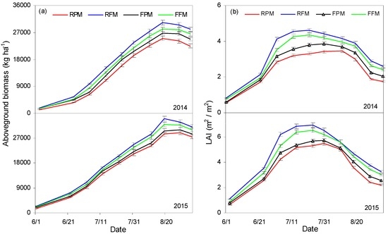 The RFM had a significantly greater accumulation of biomass than FFM, FPM and RPM, indicating a positive combined effect of full plastic film mulch and ridge tillage (Figure 8a). Biomass accumulations were significantly different among all treatments from the late jointing stage and reached a peak in the early maturing stage, even though no further biomass accumulation was recorded during the last two weeks before harvest. Additionally, the LAI of maize in all treatments were generally lower in the jointing stage and peaked in the heading stage (Figure 8b). The average LAI in RFM were 12.7%, 22.9% and 34.7% in 2014, and 0.08%, 14.5% and 19.2% in 2015, higher than FFM, FPM, and RPM, respectively. Overall, the LAI in 2015 was significantly greater than in 2014 due to abundant precipitation and irrigation. The ranking, from high to low, for biomass and LAI were RFM, FFM, FPM and RPM.