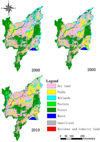 After a three-year land use overlay analysis, the area and distribution of permanent dry land (D-D), permanent paddy field (P-P), permanent forestland (F-F), and permanent wetland (W-W) were identified for the period from 2000 to 2010. In addition, the spatial information on four types of land use conversion in the same period were analysed: dry land reclaimed from forestland (F-D), paddy field reclaimed from dry land (D-P), dry land reclaimed from wetland (W-D), and paddy field reclaimed from wetland (W-P) (Table 2).