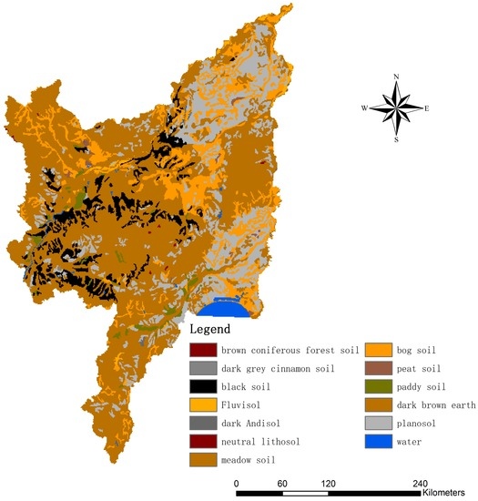 According to the USDA soil classification system [31], there are various types of soil in the Sanjiang Plain. These include black, dark brown, swamp, meadow, white pulp, paddy, peat, alluvial, grey brown, rocky, volcanic ash and brown coniferous forest soils. The six main soil types (dark brown, swamp, white pulp, meadow, black and paddy soil) account for 98.7% of the soil area over the entire Sanjiang Plain. The spatial distribution of soil types is shown in Figure 3. Dark brown soils are mainly distributed in hilly areas. White pulp soils are mainly distributed in grade I valleys at all levels on the terrace. The black soil is distributed at the top of the western piedmont platform. Meadow soils are mainly distributed in the floodplain of the main rivers. The paddy soil is found in river flood plains and on grade I terraces. Swamp soils are mainly distributed in the central low-lying areas, and are perennially wet. The lower part of the upper peat soil is mineralized to form grey soils, but if the peat layer thickness is greater than 50 cm, it is defined as a peat soil.