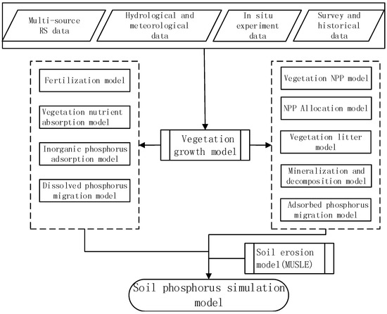After we used multi-source remote sensing data, and hydrologic and meteorological observation data to establish an ecohydrological spatial database, a distributed phosphorus migration model driven by remote sensing data was realized. Finally, the content of dissolved phosphorus and adsorbed phosphorus in surface runoff was obtained. The sum of these forms of phosphorus is TP. This provided data for further study on the spatiotemporal changes in phosphorus. The model structure is shown in Figure 4.